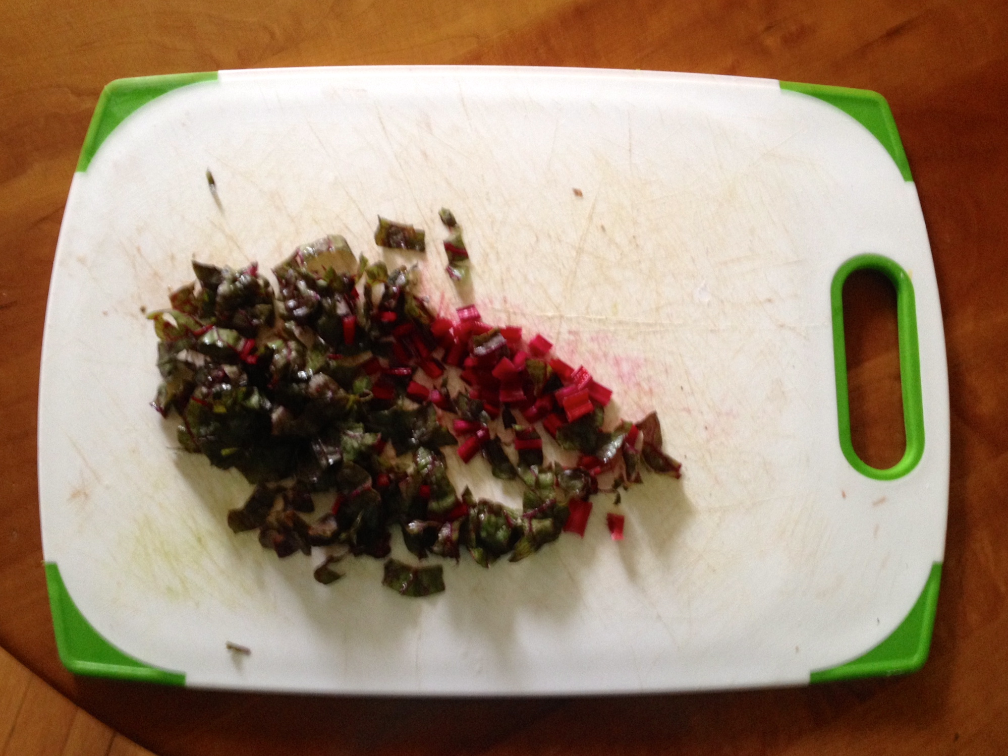 Wheatberries, wheat kernels minus hull, are a great little secret. They’re crunchy, a pretty tan color, and have a rich, almost nutty taste. Unfortunately, they are also currently out of stock in the two grocery stores that I checked, so I made a couple changes to tonight’s dinner plan. In lieu of wheatberries, I used farro, an ancient grain known for its nutty flavor. Farro is lighter in color than wheatberries so the salad didn’t look as pretty, but it tasted quite good. Wheatberries also have a firmer texture than farro. I also added Swiss chard to my salad because I had it in the fridge and used Quorn instead of chicken. As my mum wrote in the cookbook she made for me when I was in college, “Chicken is delicious in this salad, but not imperative . . . If you don’t use chicken, you may omit the thyme.” I included the thyme to flavor the Quorn.