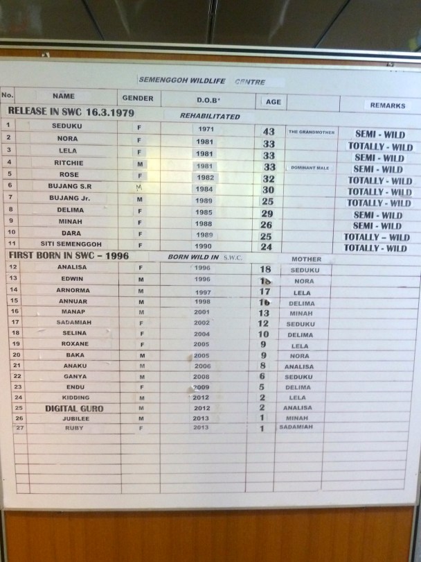 Handy chart helping visitors understand the family structure of these orangutans, when they arrived at the center, and how old they are