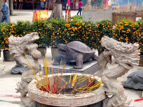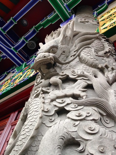 One of the things I love about Southeast Asia are temples located in the middle of big, bustling cities. Hong Kong’s oldest temple, Man Mo Temple, dates to 1847. It sits next door to massive high-rises and crowded with Buddhists lighting incense and praying. The smoke was so thick inside that it was hard to breathe, even more difficult than in the rest of Hong Kong. (The fire alarm in our hostel went off early one morning because of the smog.)
