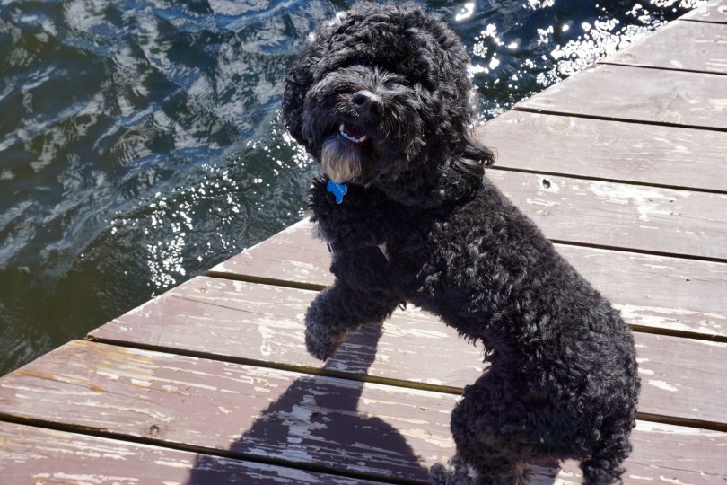 DSC00319 Monday, 10 July 2017 6000 × 4000 Up in the Adirondacks Our dog, Puck, posing for a photo on the dock