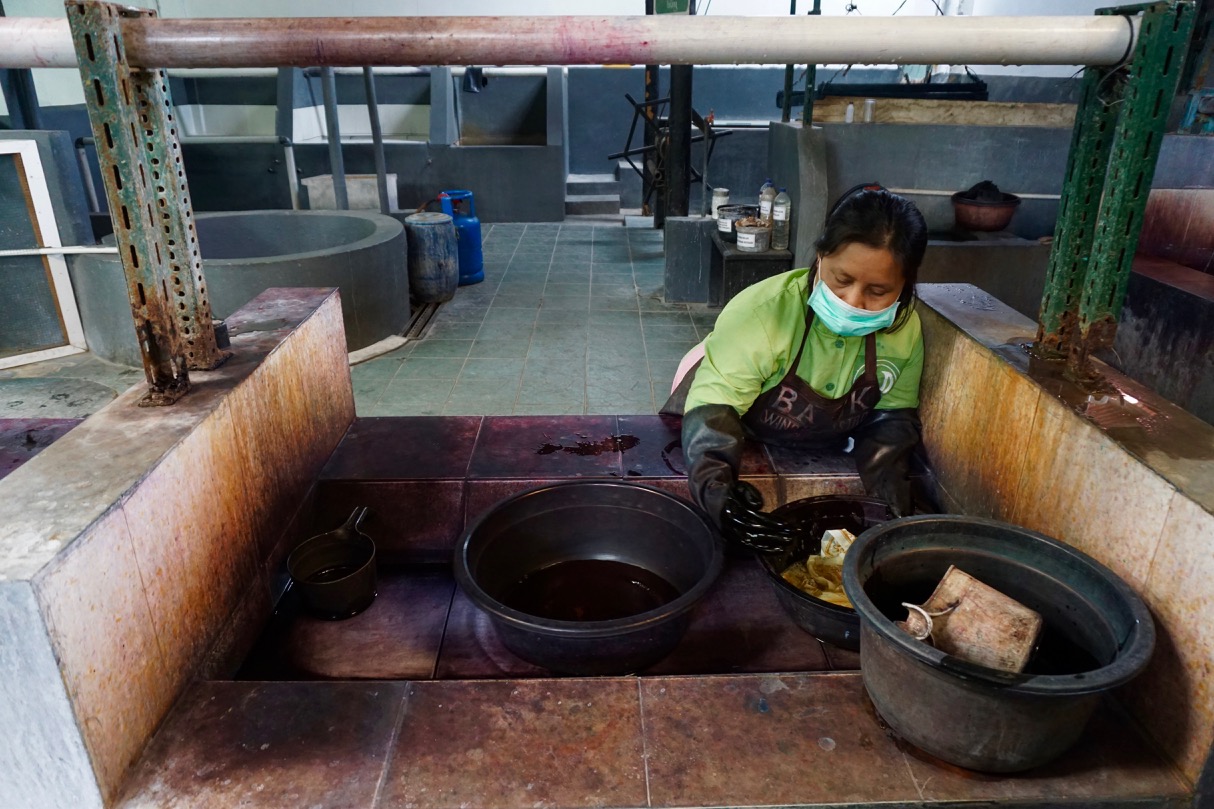 The following day we visited Batik Winotosastro, an active batik workshop that also hosts batik classes for visitors. Our experience there was fantastic and I highly recommend a visit. A lovely woman introduced us to the workshop and set us right to work. We chose patterns to trace onto our cloth and then she moved us over to real batikers. We learned how to hold the dipper that contains the wax (I’ll be honest – I found this really difficult) and proceeded to trace the lines we’d just penciled. The batikers were working on additional layers of colour beyond the base layer and it was amazing to watch them and see how intricate, detailed, and precise their lines were. They prettied up our wax outlines while our guide showed us around the workshop.
