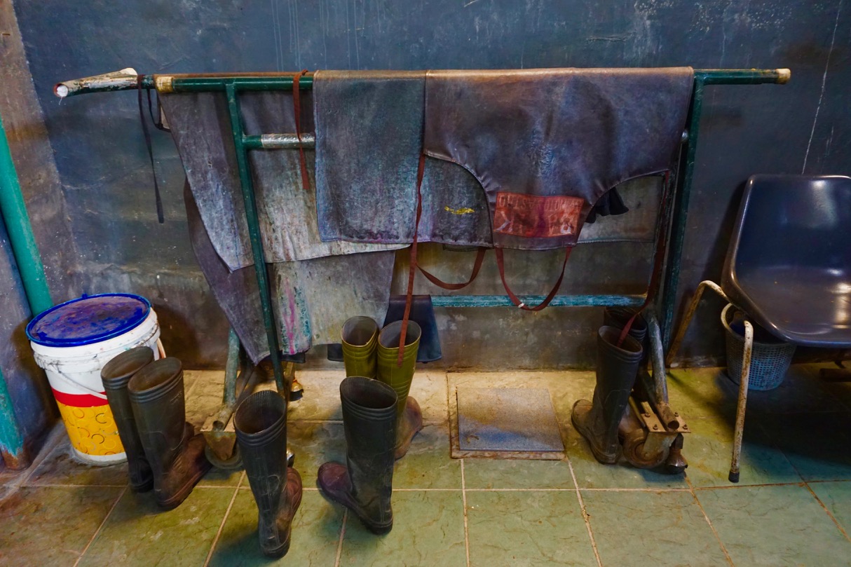 Batik can be hand drawn or stamped, we learned. The stamps are copper and have been around a very long time, but the hand drawn batik are more expensive. When our batik were prettier than we’d left them, our guide took us over to the woman responsible for dyeing . . .