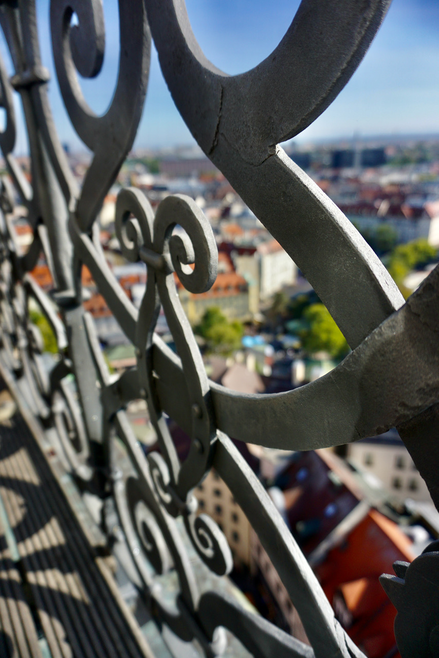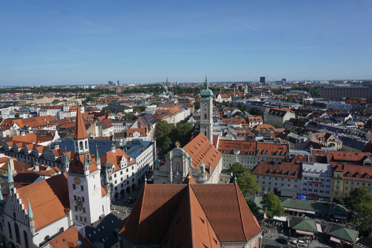 My Oktoberfest experience came later, however. Due to the beautiful weather, I was determined to remain outside as long as I could. This first meant standing in line to climb the tower at Saint Peter’s Church. I do enjoy a good church tower for a view and the passing people, many in traditional clothing and having a good time, provided plenty of diversions. Half an hour in line and about 300 steps later brought a wonderful view. People had said you can see all the way to the Alps and they were absolutely right.