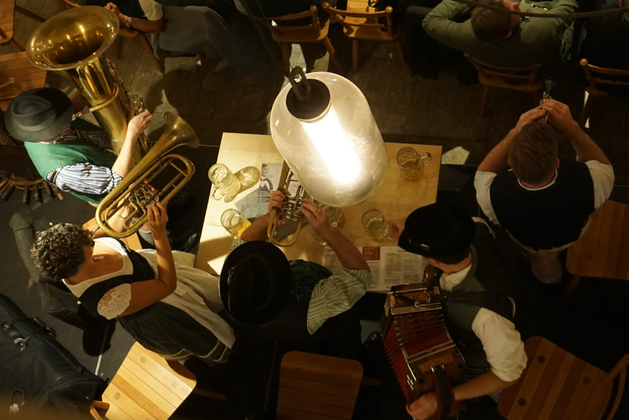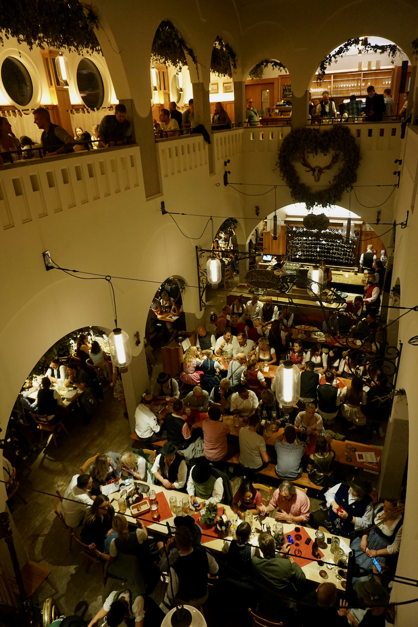 And then I got lucky. I had given up on a beer garden and decided I’d have a drink outside and watch the world go by. But then I heard music and the man at the door directed me up the stairs to the drinks-only open-air balcony above a beer hall. I found a spot by the railing and laughed out loud. The music, costumes, food, huge beer steins, the noise, laughter, drinking songs: It was just like the movies.