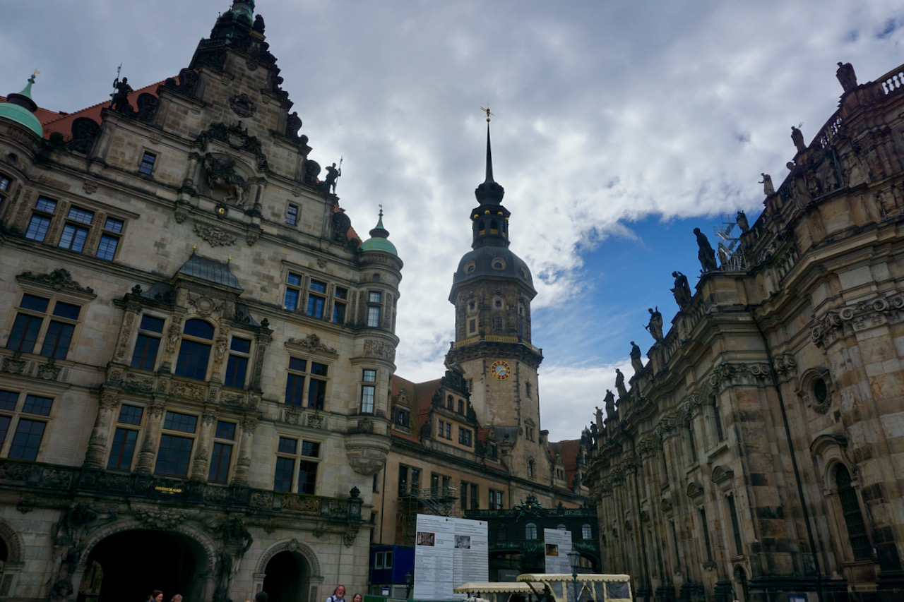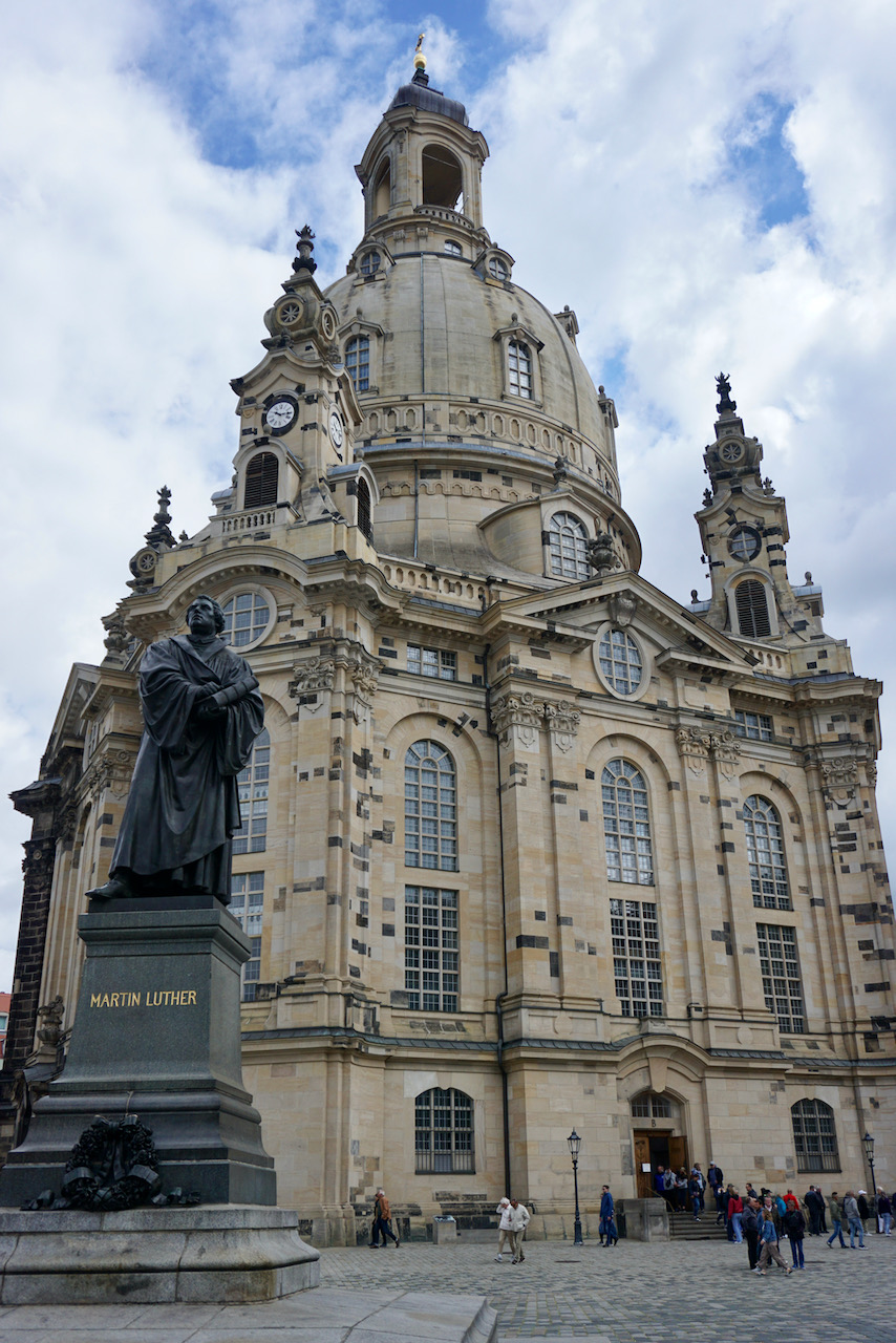 The following morning I stayed on the Altstadt side of the river and joined a walking tour to learn about the history of Dresden. We covered the time period from the Holy Roman Empire through present day, and I was again struck by how old Europe is. I am still tickled by this. Notable stops on the tour included the famous Frauenkirche, which was rebuilt using some of the recovered stone that had been part of a memorial after World War II . . .