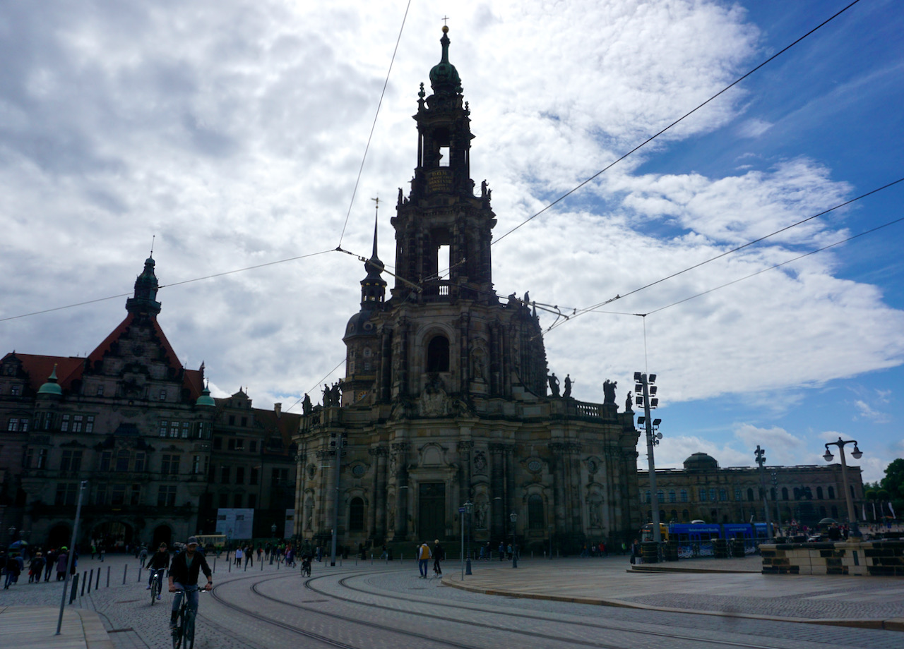 . . . past the Catholic church built by Polish king Augustus the Strong during his role as Elector of Saxony . . .