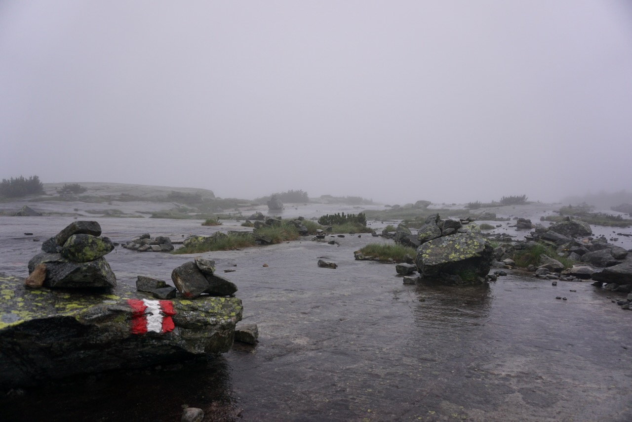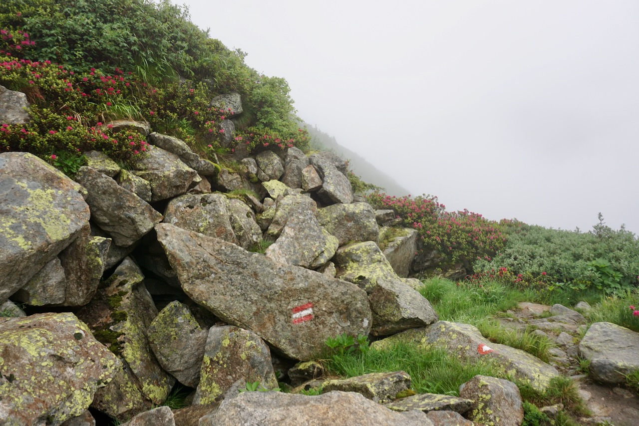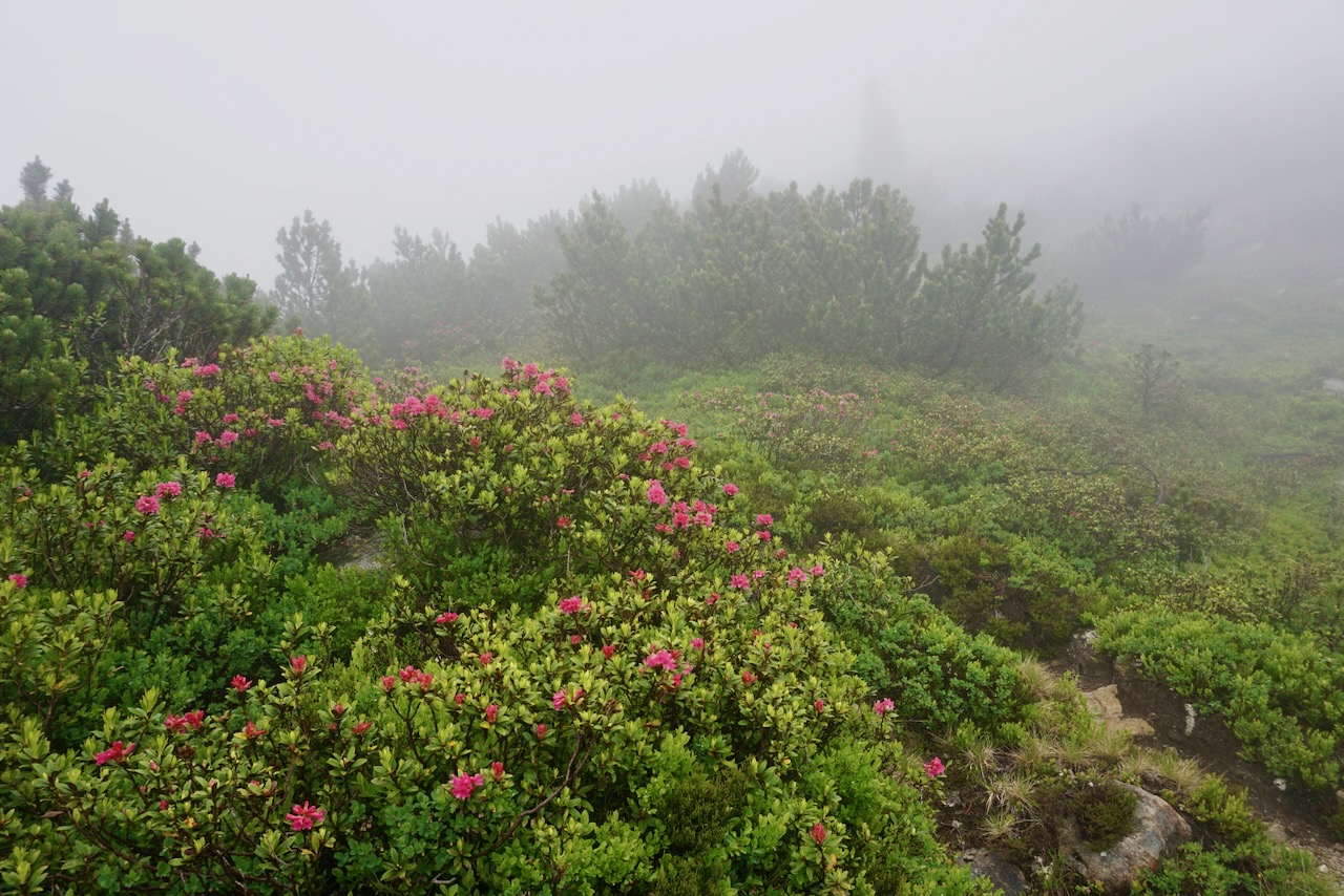 We began following the trail markers over sheets of rock that gave way to a trail that wound through scrubby trees and bushes marking the end of the tree line. The tiny alpine flowers provided pops of colour through the fog.