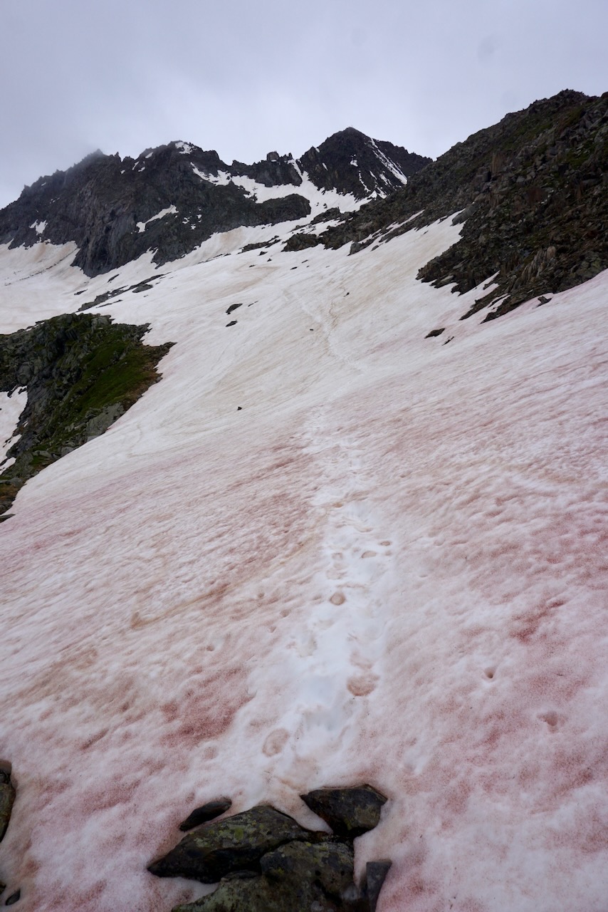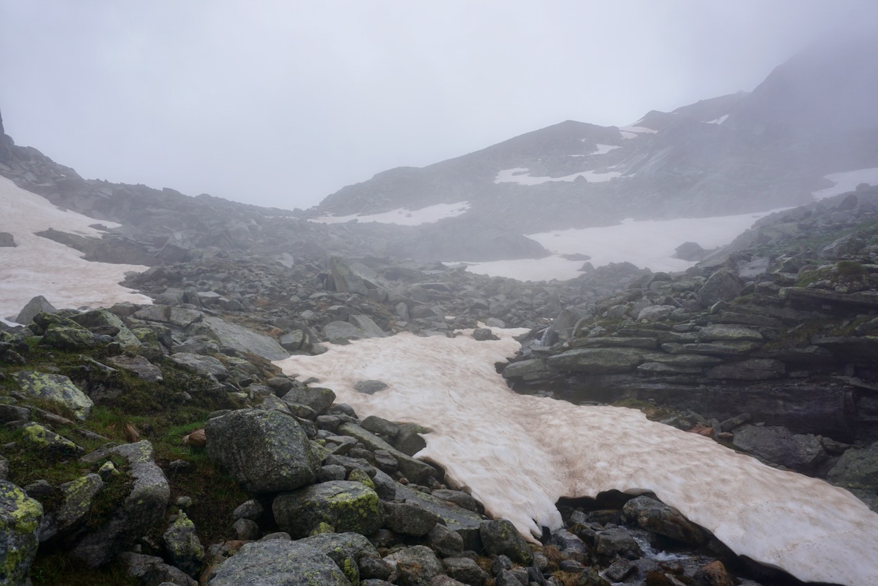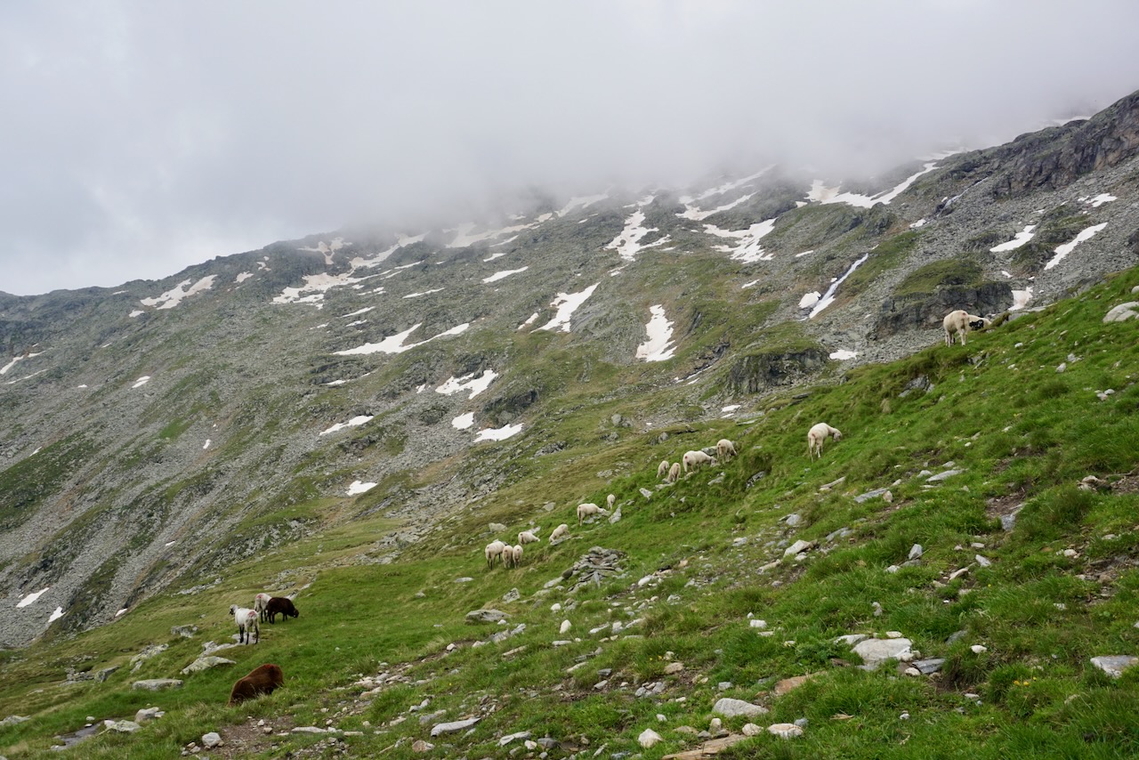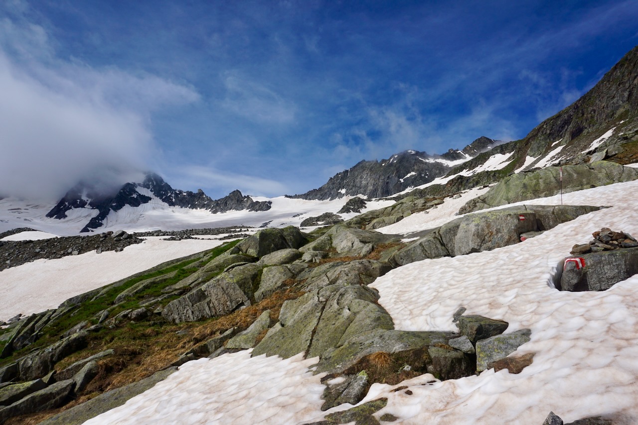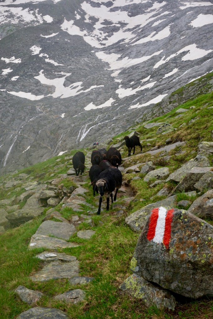 . . . comprised of a clear path that zig-zagged along the side of the mountain. There was no way-finding using markers, no need to stop and think before putting one foot in front of the other. And because of its straightforwardness, it was busy and crowded. While not a path that I’d recommend doing in sandals, there were plenty of hikers doing just that. Choosing strategic points to get by them was about as challenging as it got, and we reached the Olpererhütte rather uninspired.