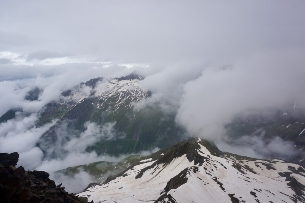 The rain was kind enough to stop for a while as we reached the summit of Schönbichler Horn at 3,133 meters. Exhausted from the efforts of the previous hours, which had us well behind schedule but clearly past the threat of thunderstorms, we did not linger long, aware of how much farther we had to go.