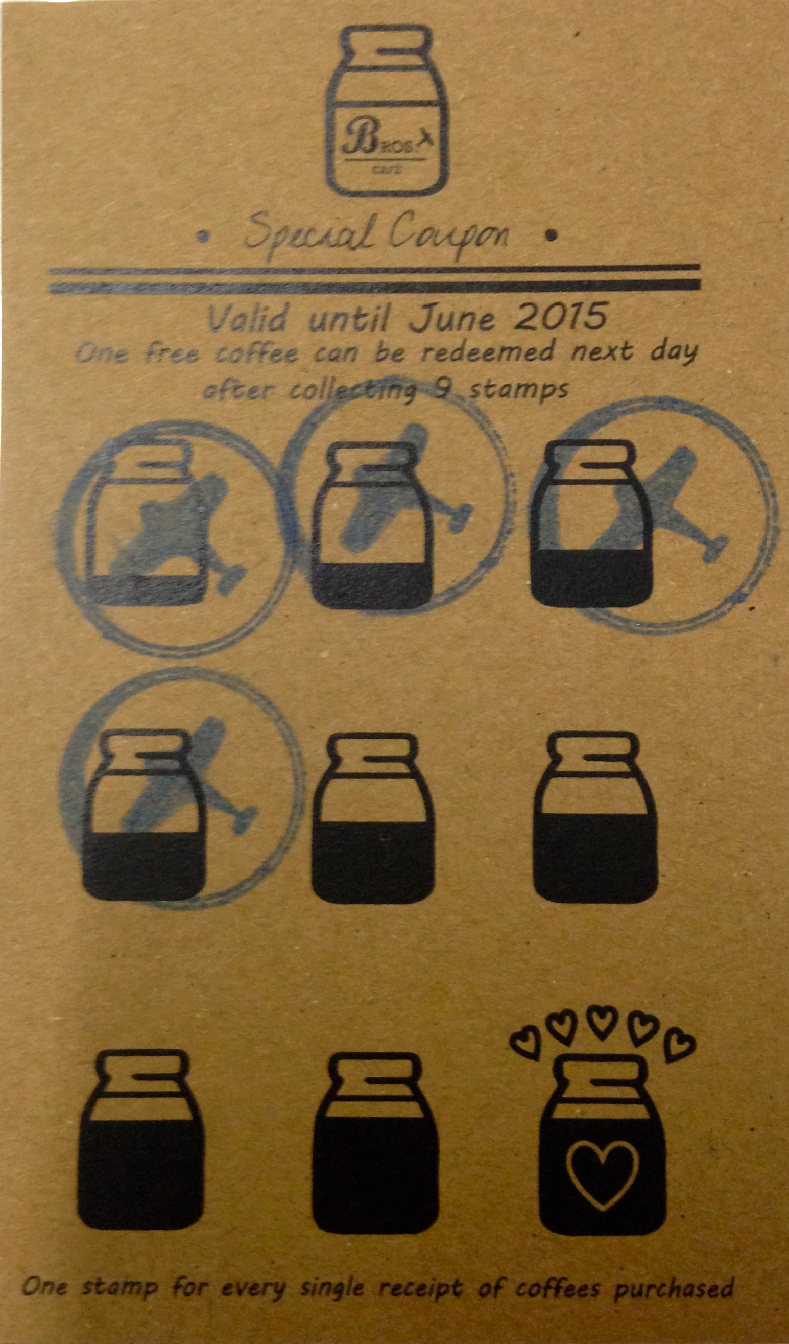 Mitch and I went to Bros Cafe twice this weekend. When we walked in today, the barista recognized us and gave us a coffee card with four stamps filled in. “Two from yesterday,” she told us.